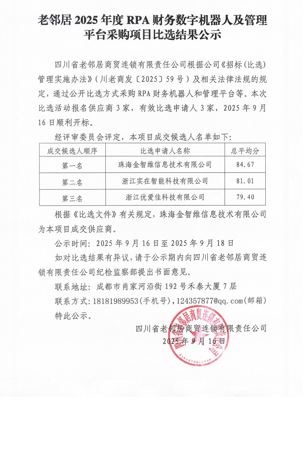 老邻居2025年度RPA财务数字机器人及管理平台采购项目比选结果公示